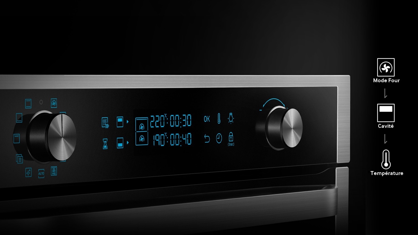 Press twice and turn the value dial to value dial to set a desired time up to 23 set a desired end time. Ce four encastrable samsung nv75k5571rs inox est dote de la technologie twin convection grace a ce systeme vous beneficiez de 2 cavites independantes ideales pour cuire 2 plats simultanement a des temperatures et temps differents. Turn the mode selector to choose a mode or function.