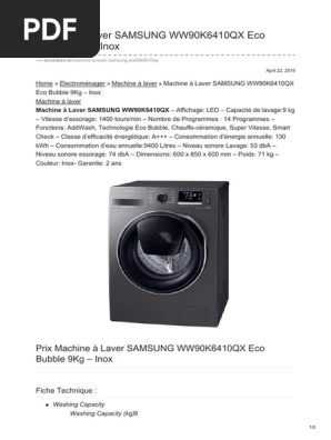 Machine à Laver Samsung Ww90k6410qx Eco Bubble 9kg Inox
