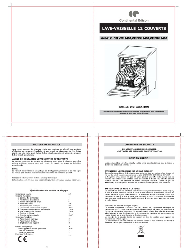 Notice Lave Vaisselle Continental Edison Celv1249 Et Pièces